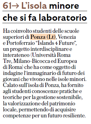 Ha coinvolto studenti delle scuole superiori di Ponza (LT), Venezia e Portoferraio “Islands 4 Future”, un progetto interdisciplinare e interateneo (Università Roma Tre, Milano-Bicocca ed Europea di Roma) che ha come oggetto di indagine l’immaginario di futuro dei giovani che vivono nelle isole minori.